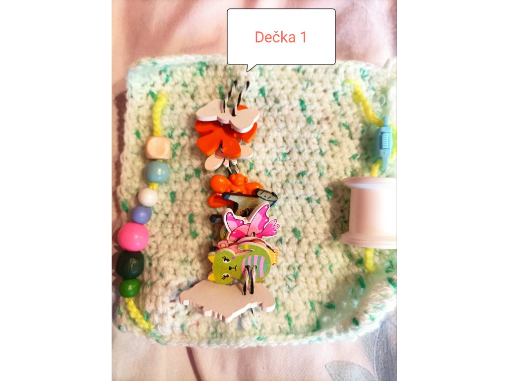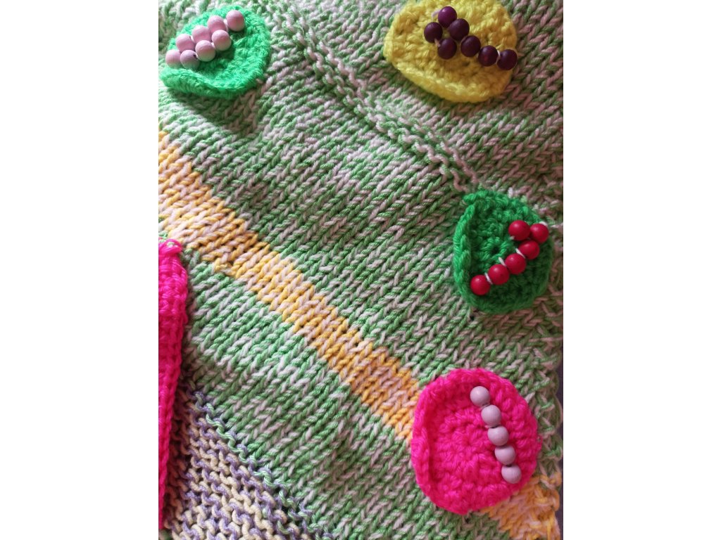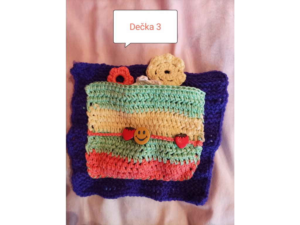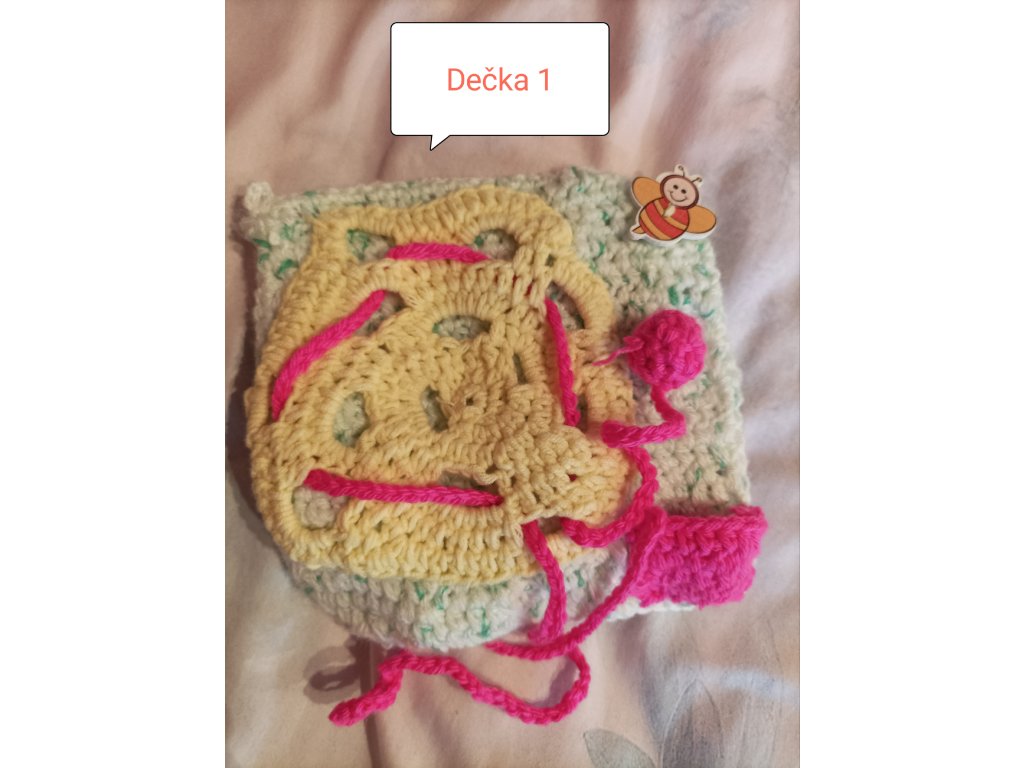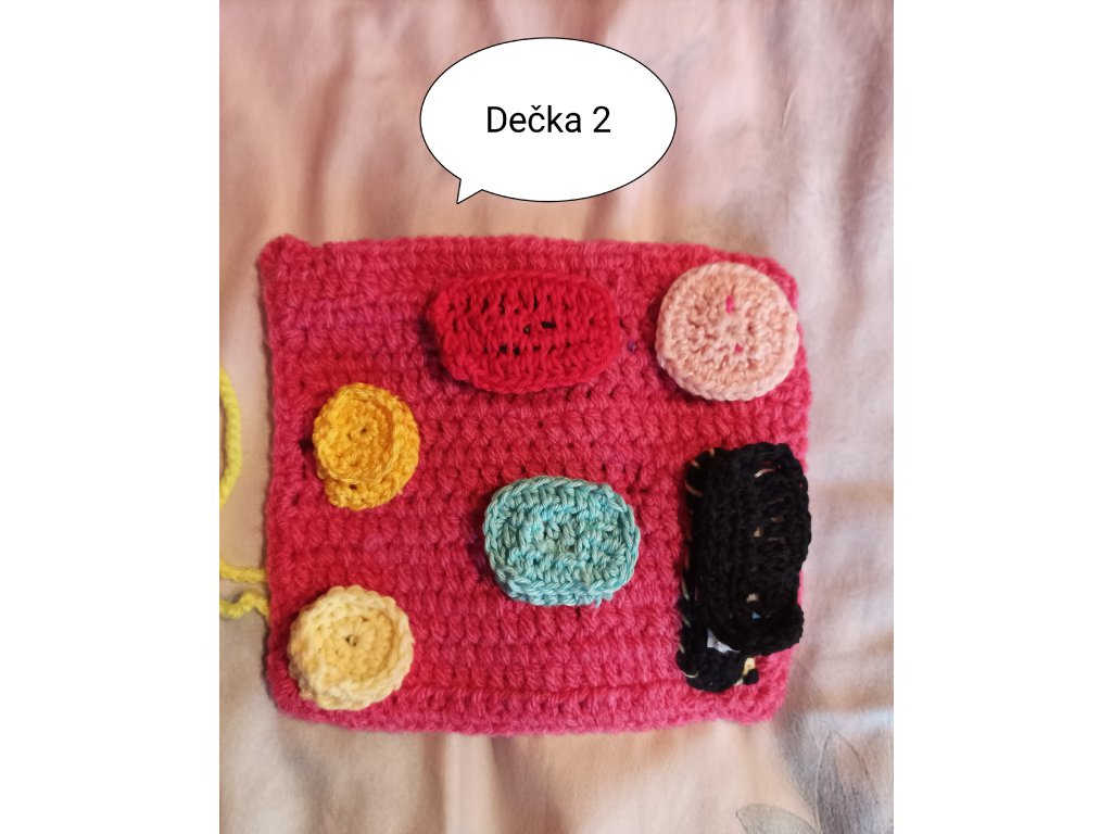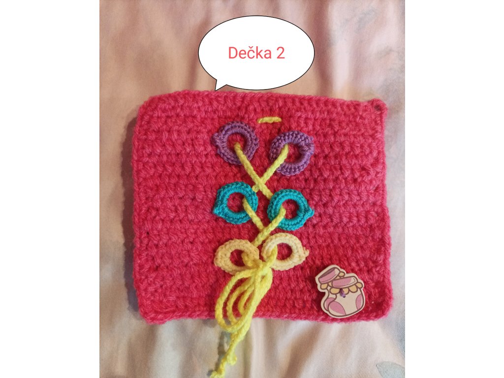 Ručně háčkovaná dečka určená pro děti v předškolním věku a první třídu – ale potěší i seniory jako aktivizační pomůcka.