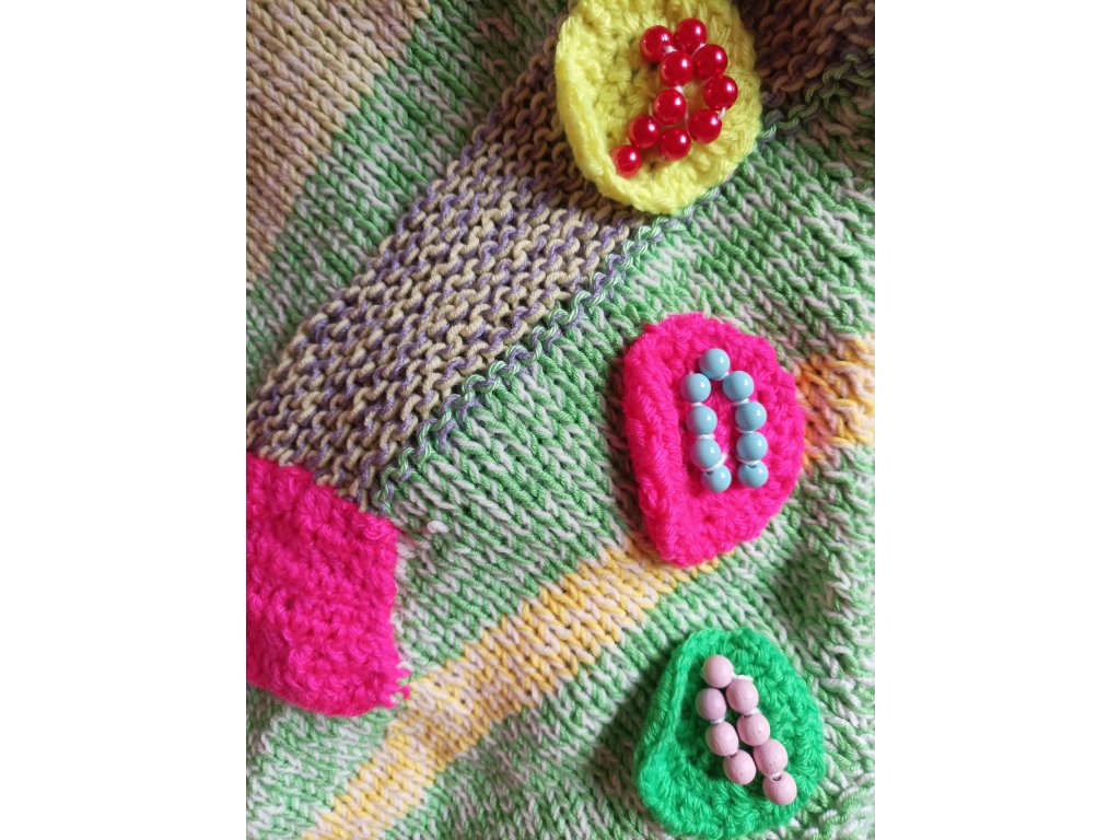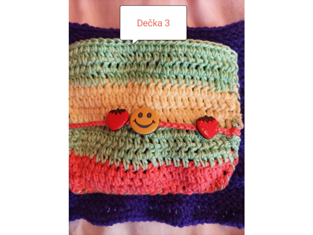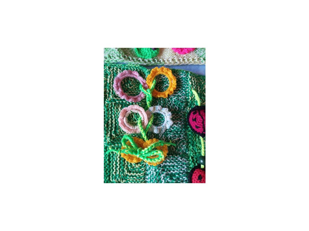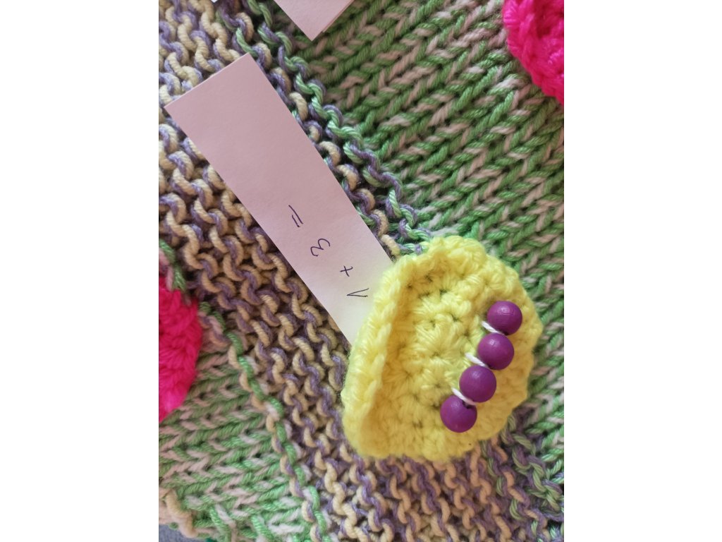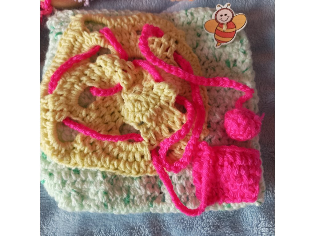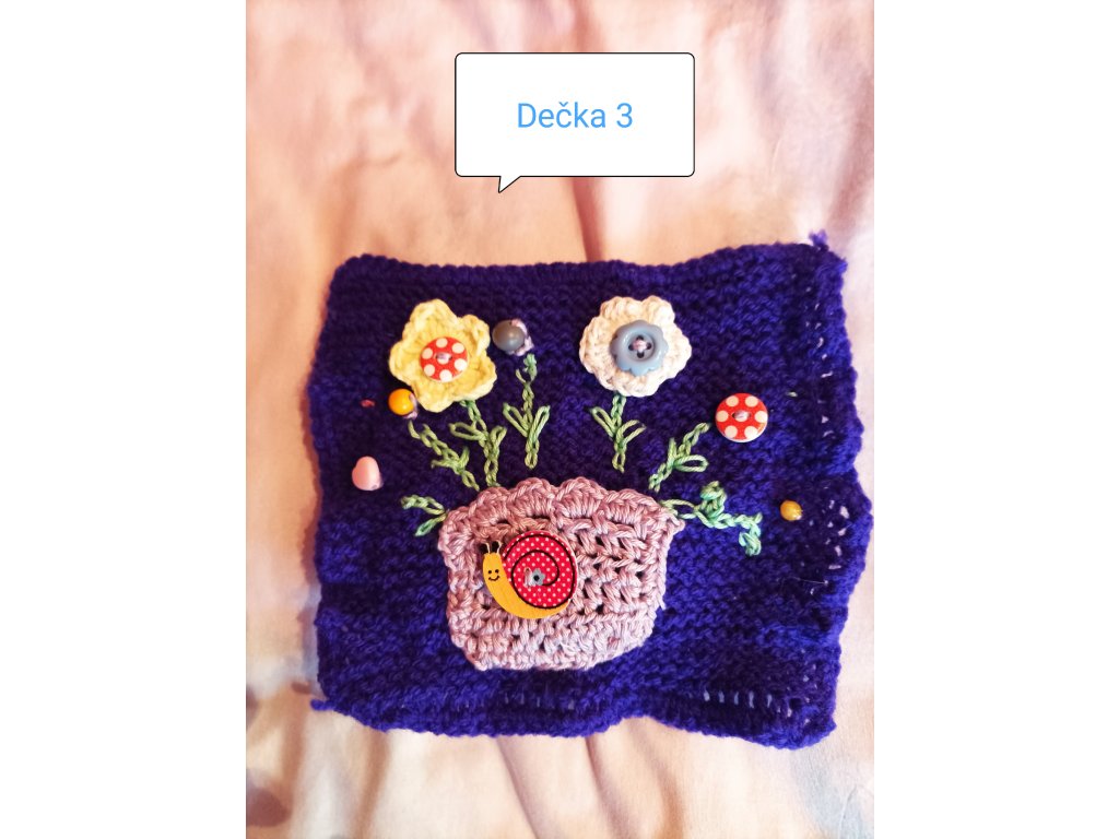 Ručně háčkovaná dečka určená pro děti v předškolním věku a první třídu – ale potěší i seniory jako aktivizační pomůcka.