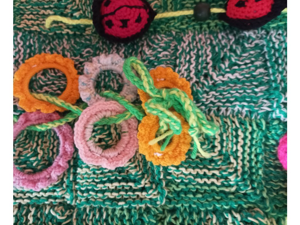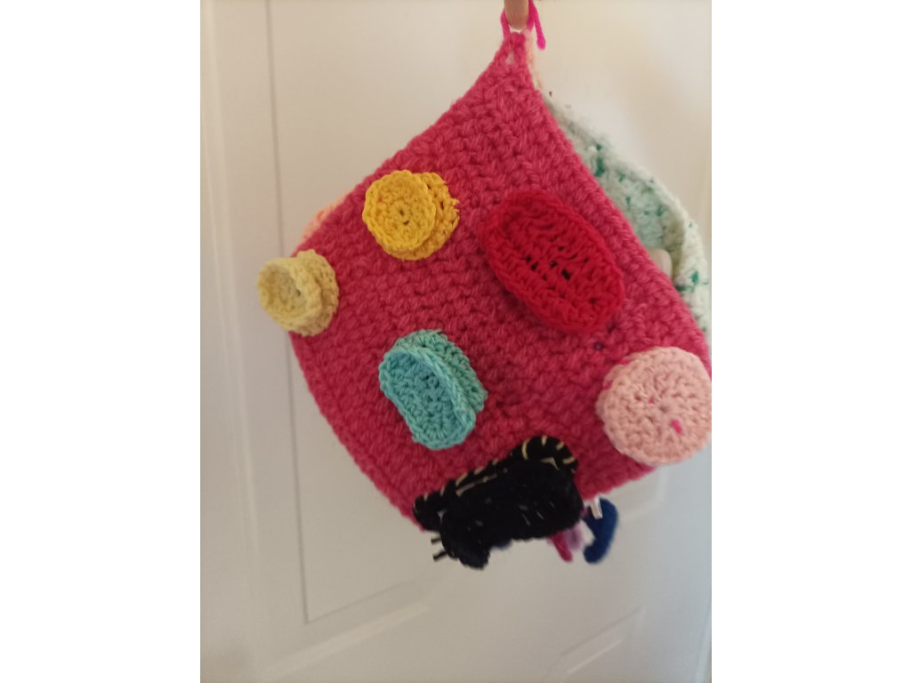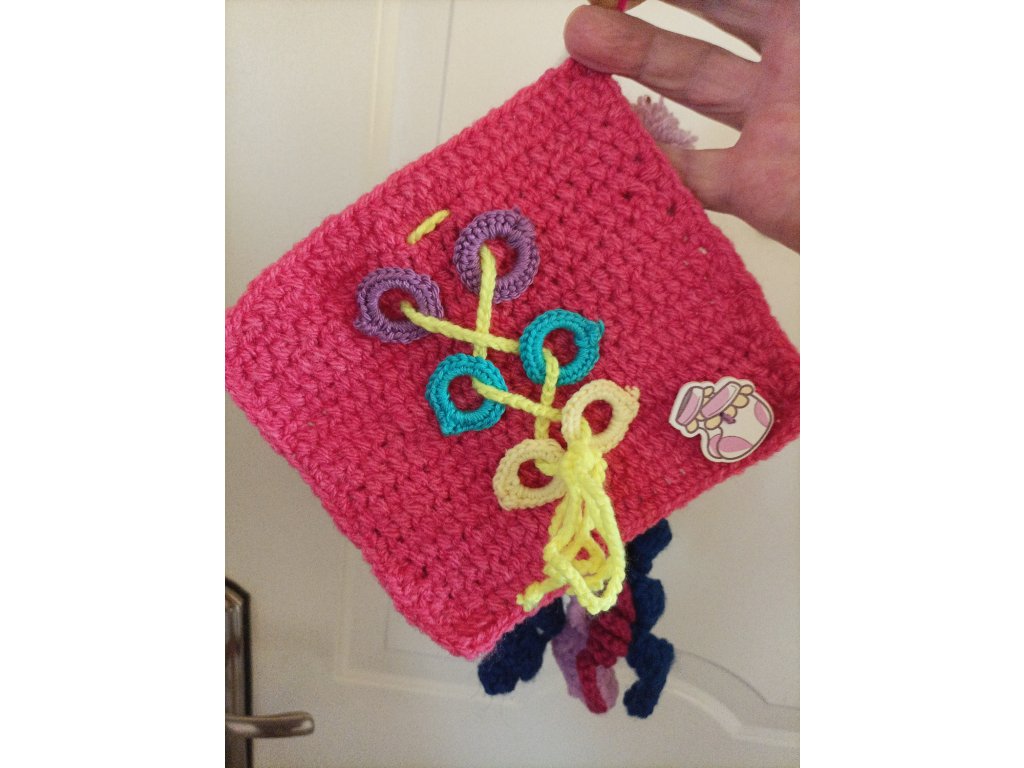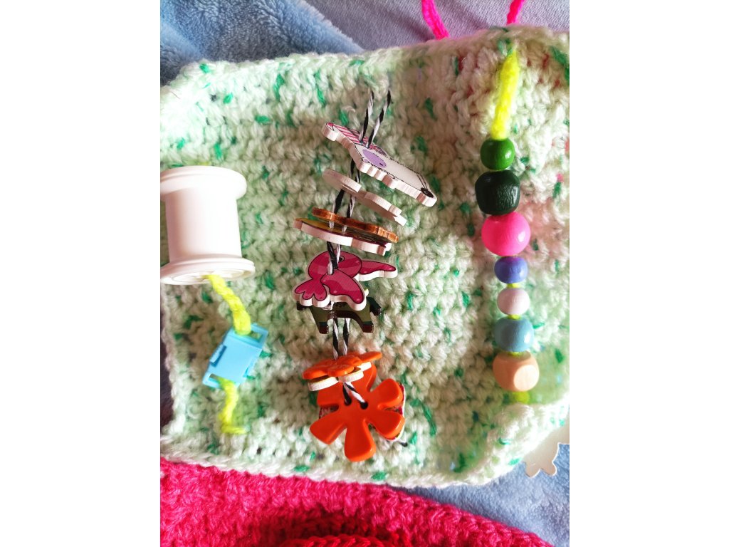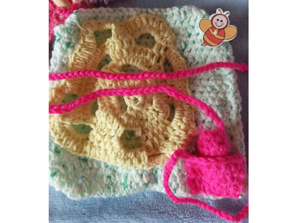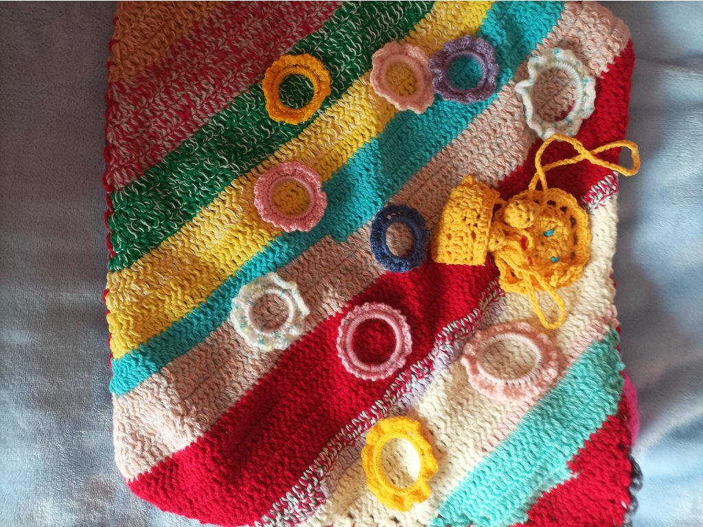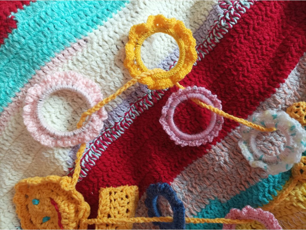 Ručně háčkovaná dečka určená pro děti v předškolním věku a první třídu – ale potěší i seniory jako aktivizační pomůcka.