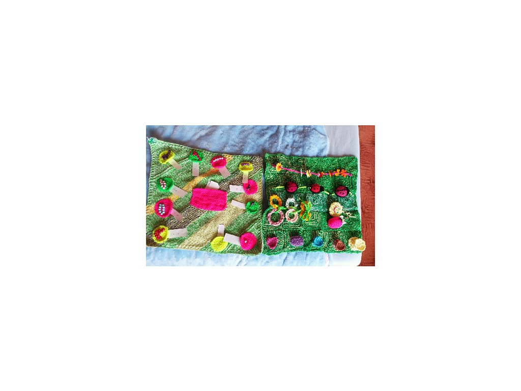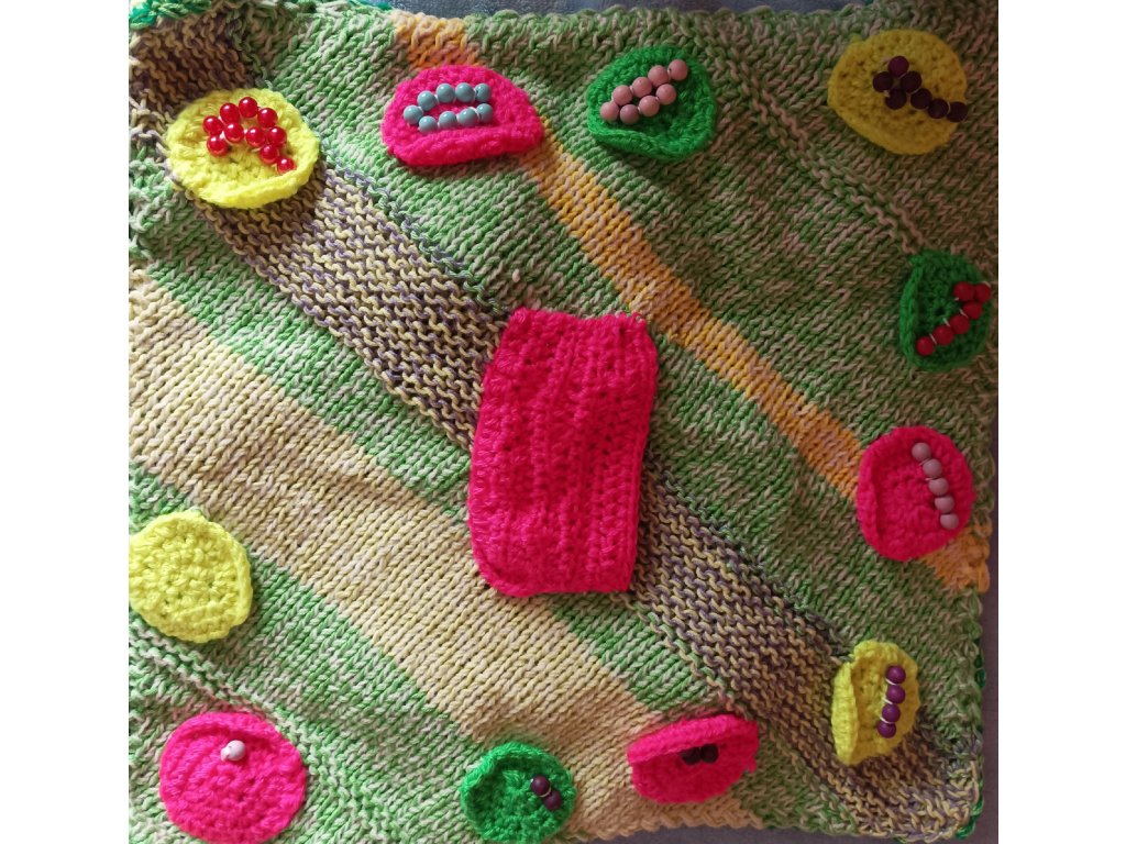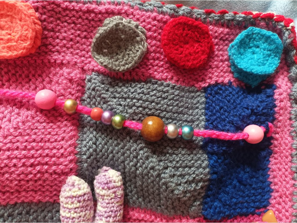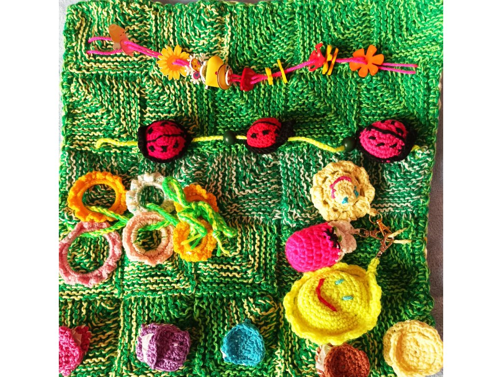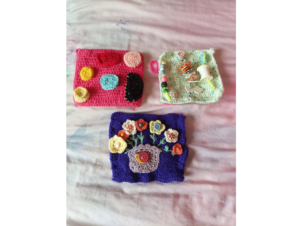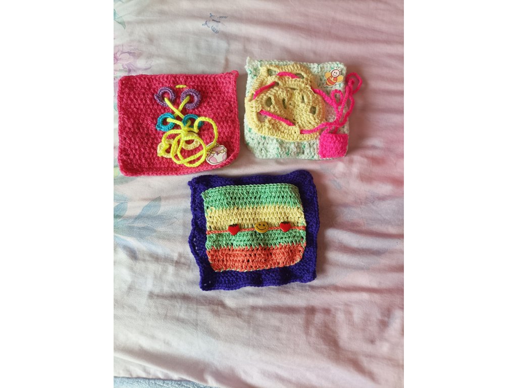 pletené a háčkované, cca 15x15 cm,oboustranné,každá dečka je zaměřená na 1-2 interaktivní prvky.