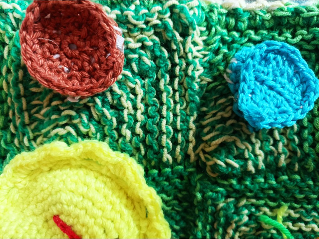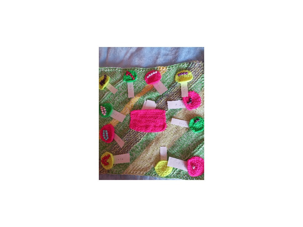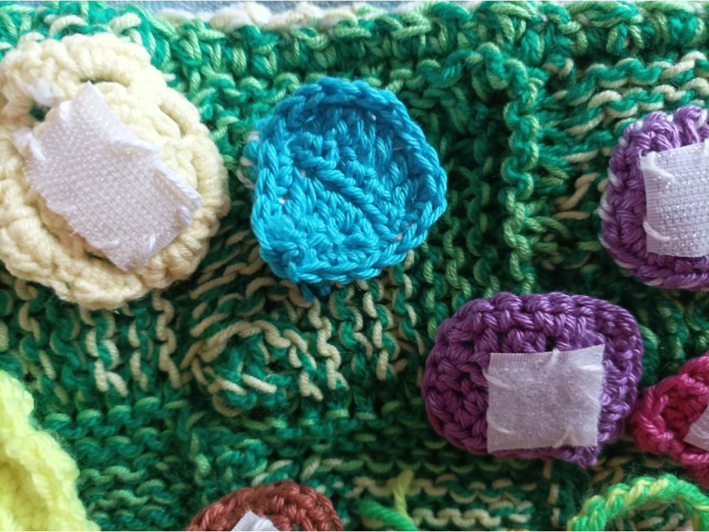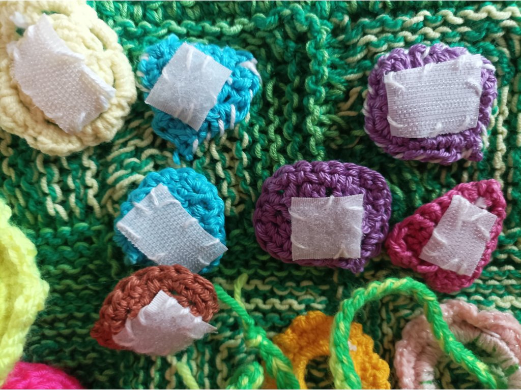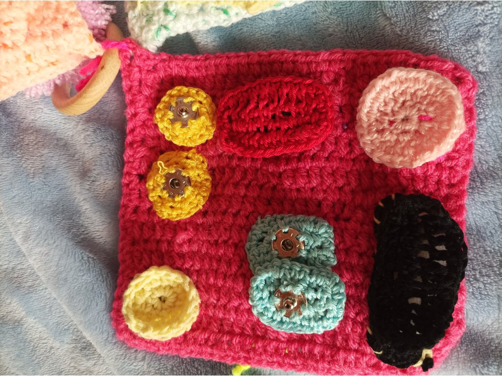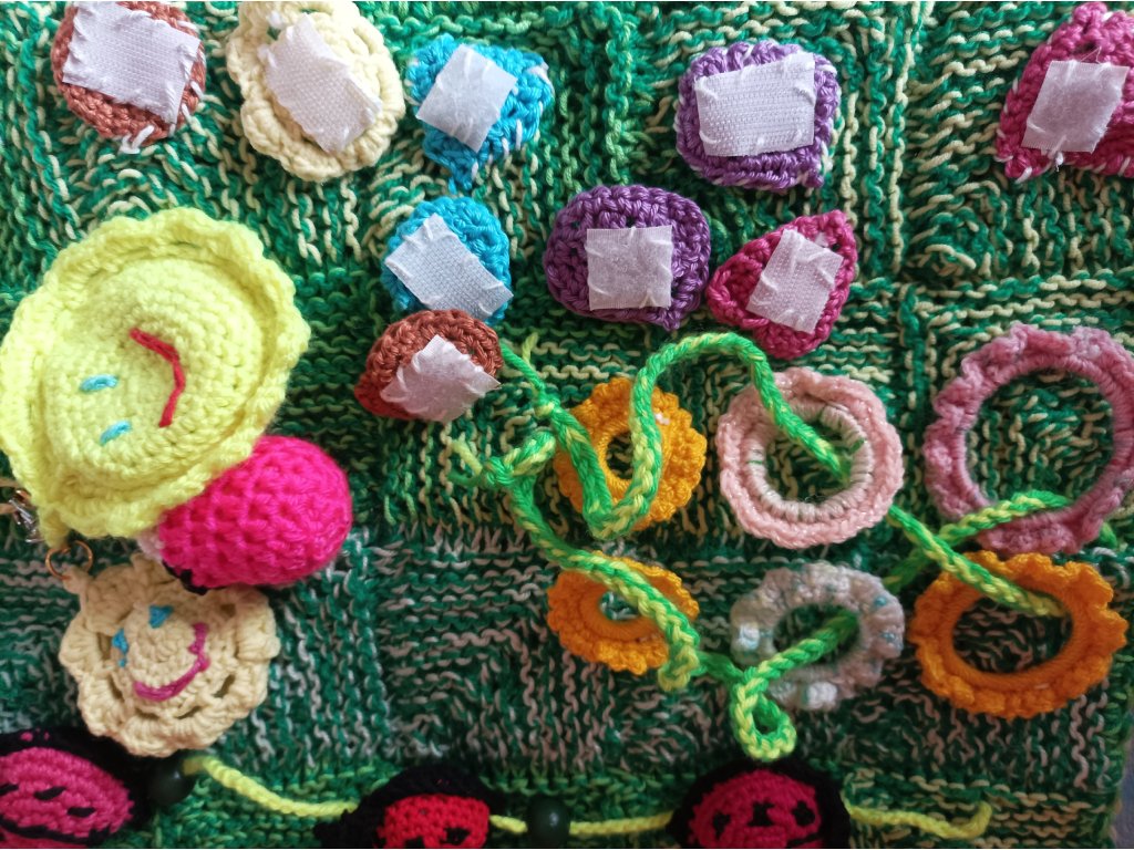 pletené a háčkované, cca 15x15 cm,oboustranné,každá dečka je zaměřená na 1-2 interaktivní prvky.