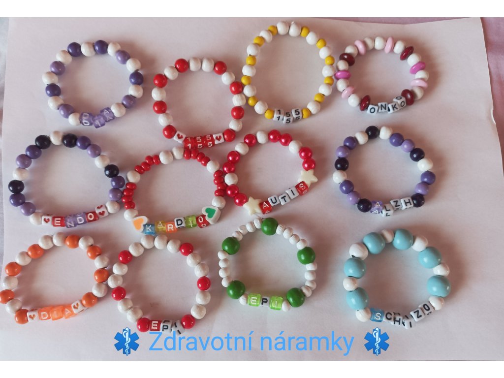 - Zdravotní pomůcky - patří mezi ně např. zdravotní náramky s korálky a textem různých onemocnění jako Epi,Onko,Autis,Alzh a jiné. Pomáhají okolí a zdravotníkům zachránit třeba i život.Korálky jsou navlečené na pružince. Vyberte si barvu a text a napište do zprávy.