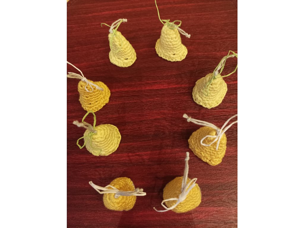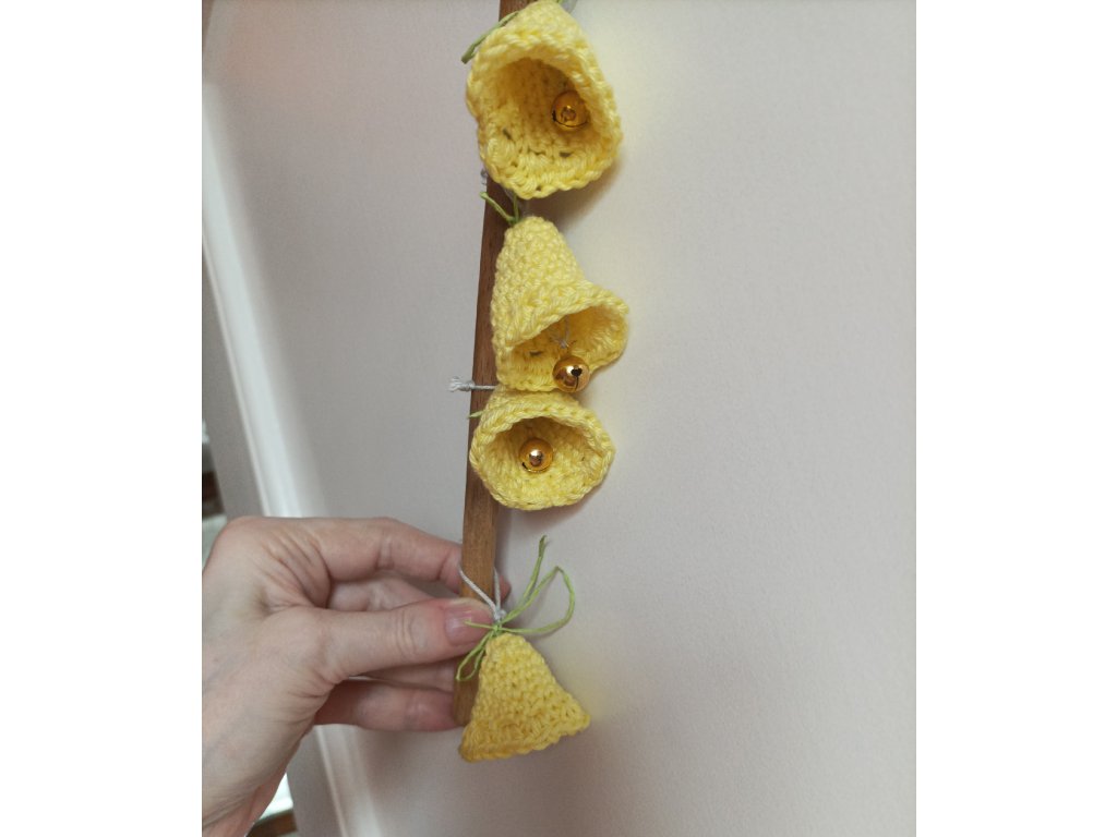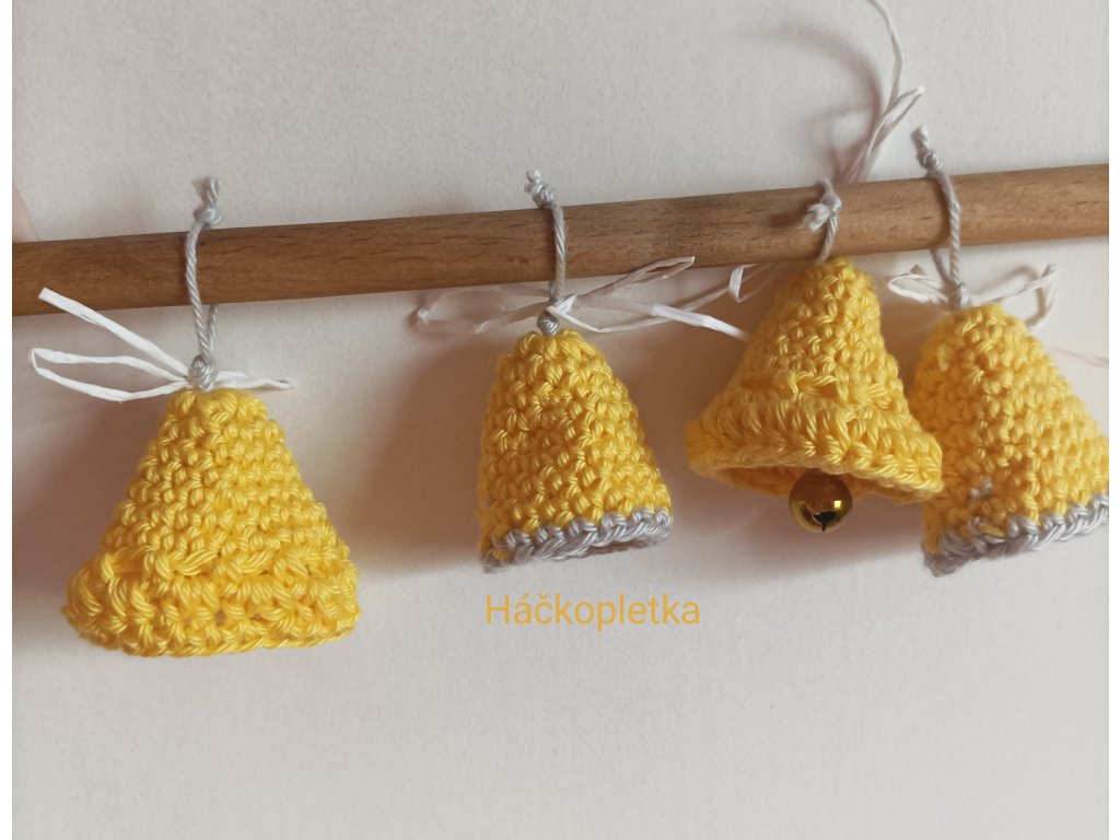 🎄15. Zvonečky.Háčkované z bavlny ve žluté barvě ,doplněné o zlaté rolničky a šňůrky na pověšení.Vánoční ozdoba,stačí přidat háček.