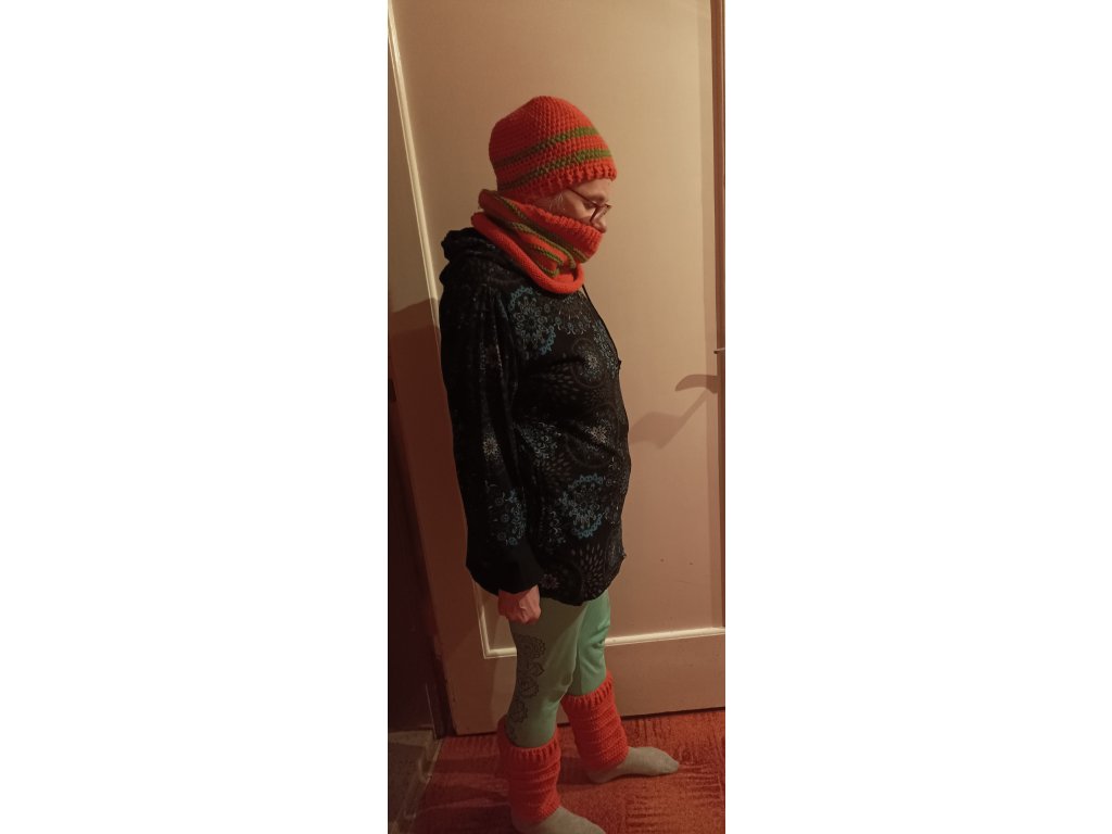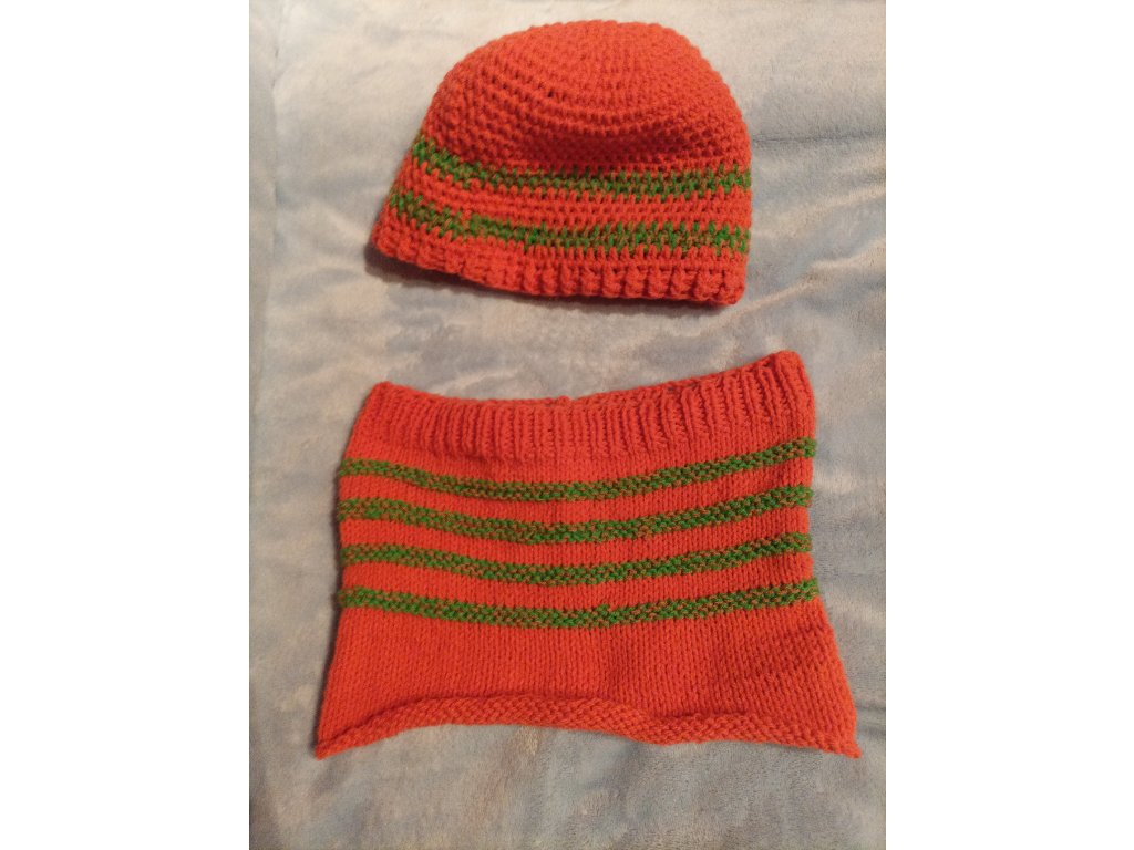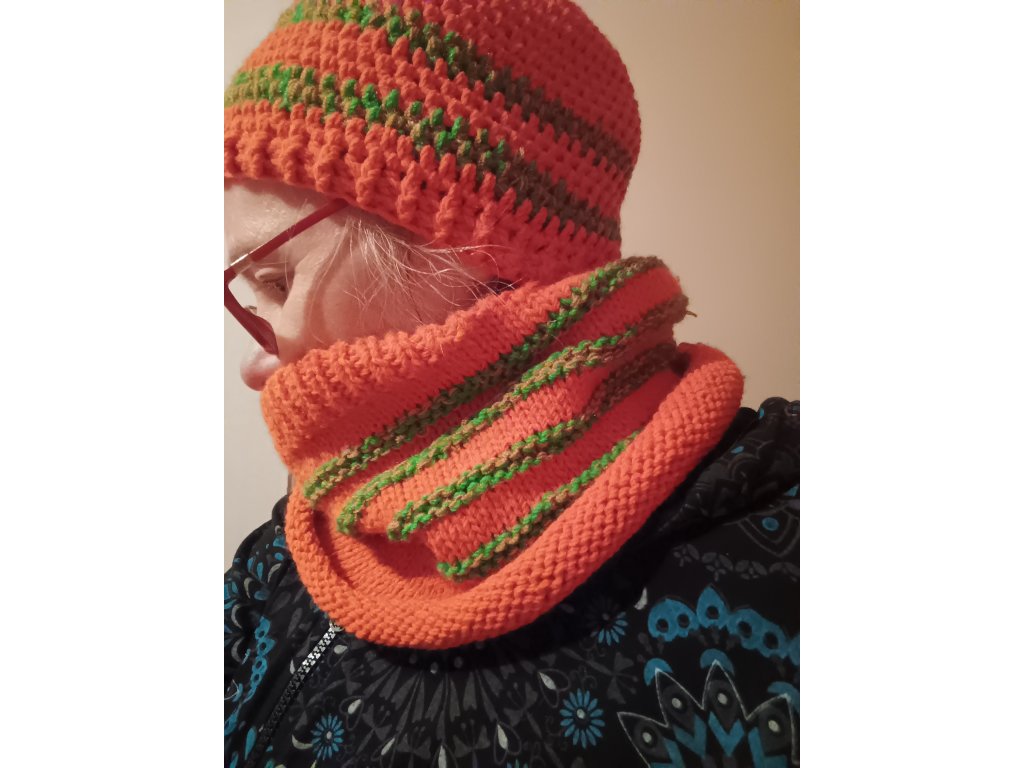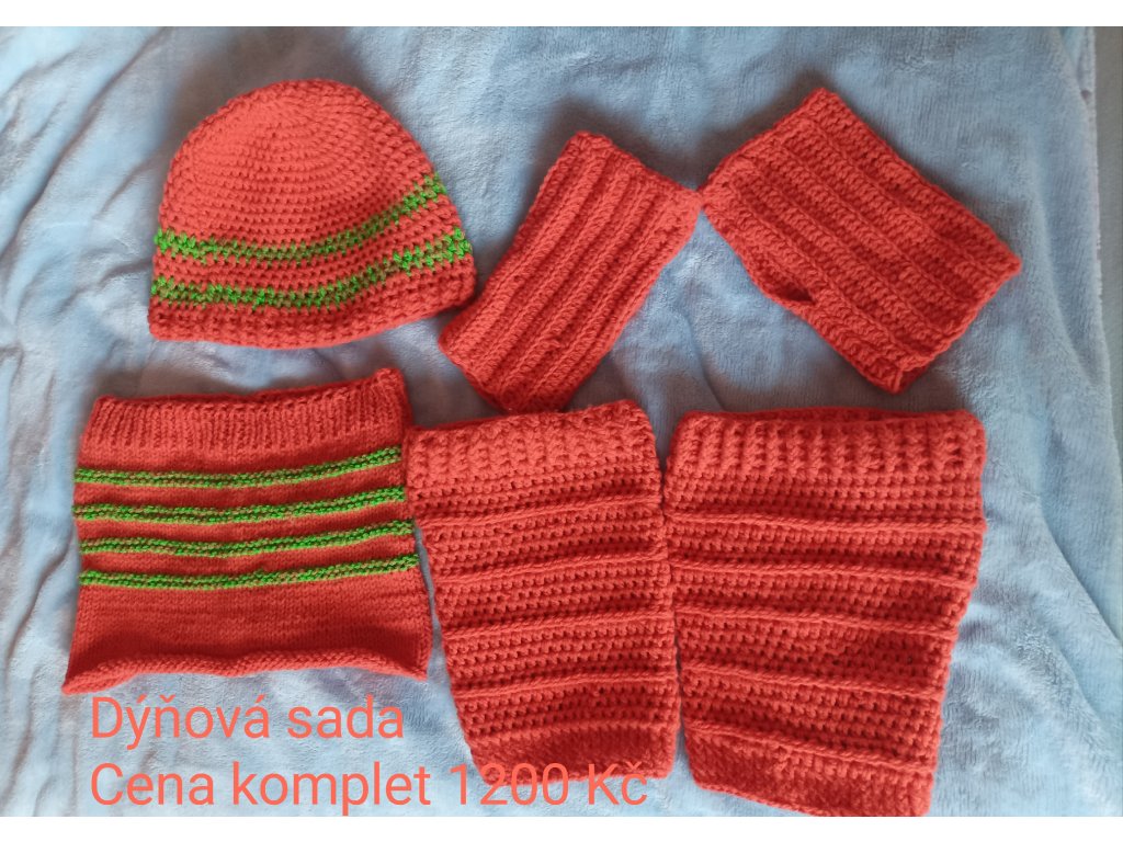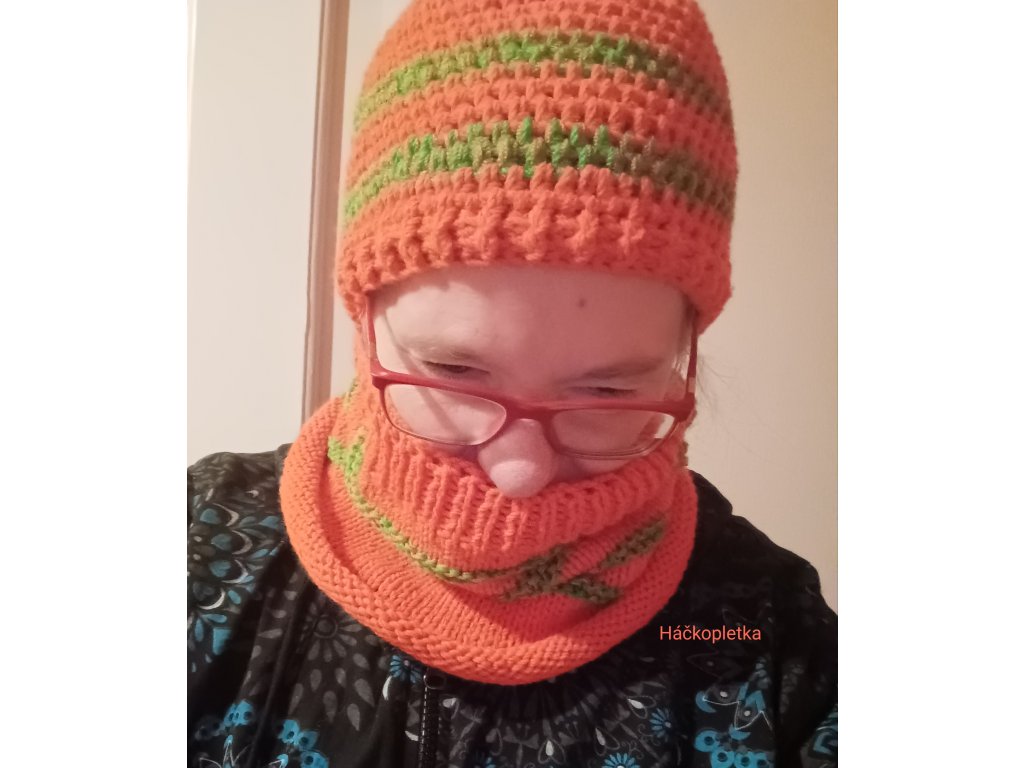 🎃16. Dýňová sada - čepule a nákrčník z akrylové příze zrzavá, zelená, obvod 54-60 cm.Pletené, háčkované, ruční praní.Lze přidat návleky na nohy.