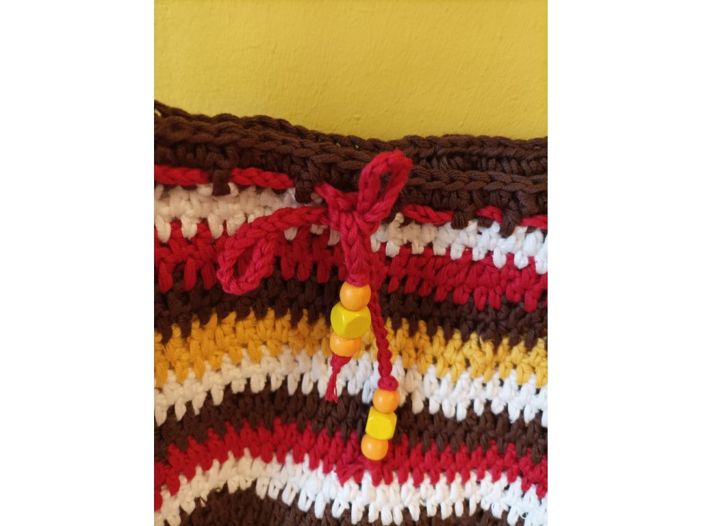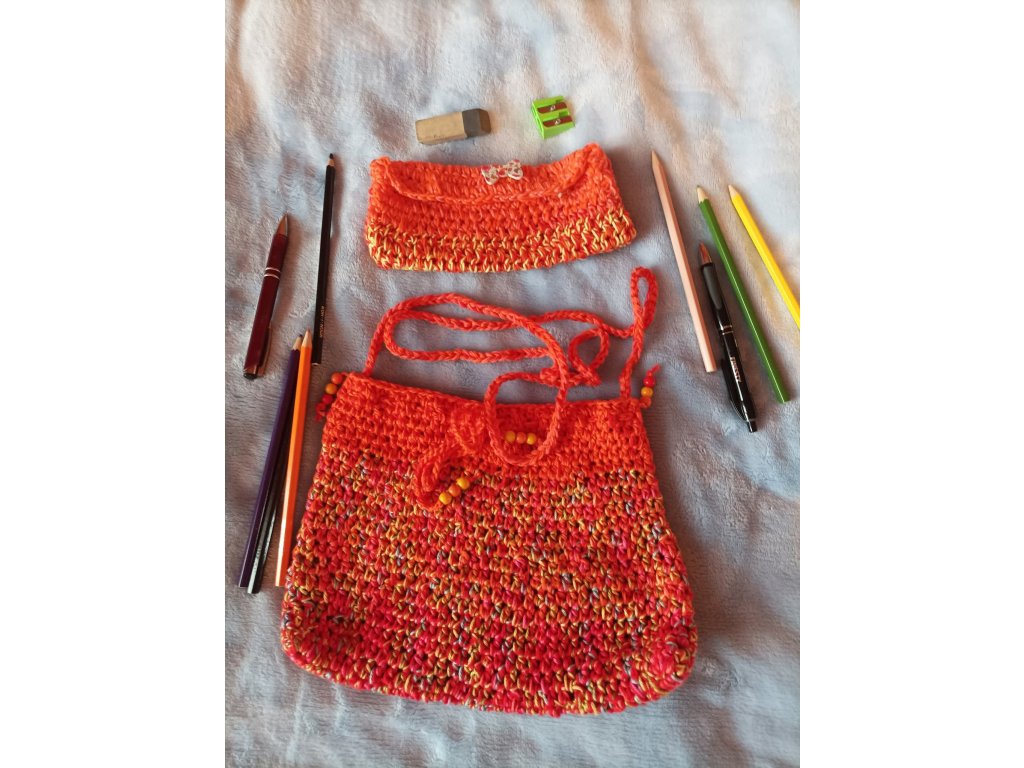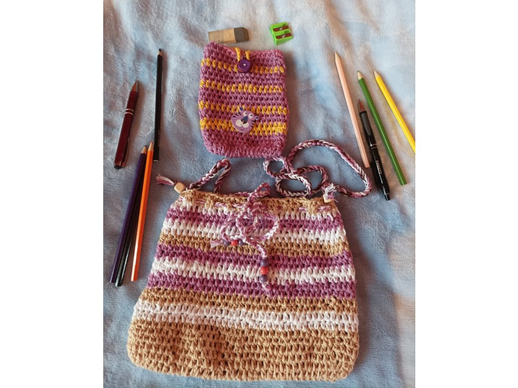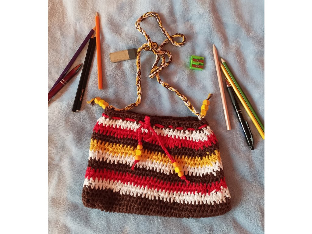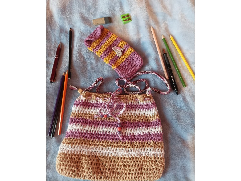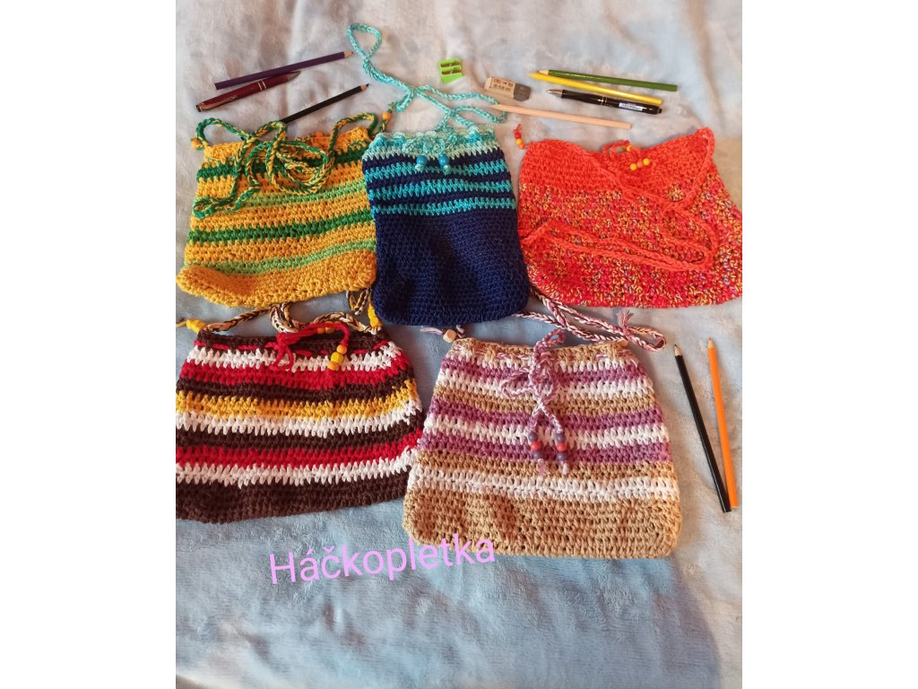 1. Veselé tašky na školní pomůcky,do kroužků i na výlet.Háčkované z pevné bavlněné příze, 30x25 cm,praní v pračce na 30 stupňů.