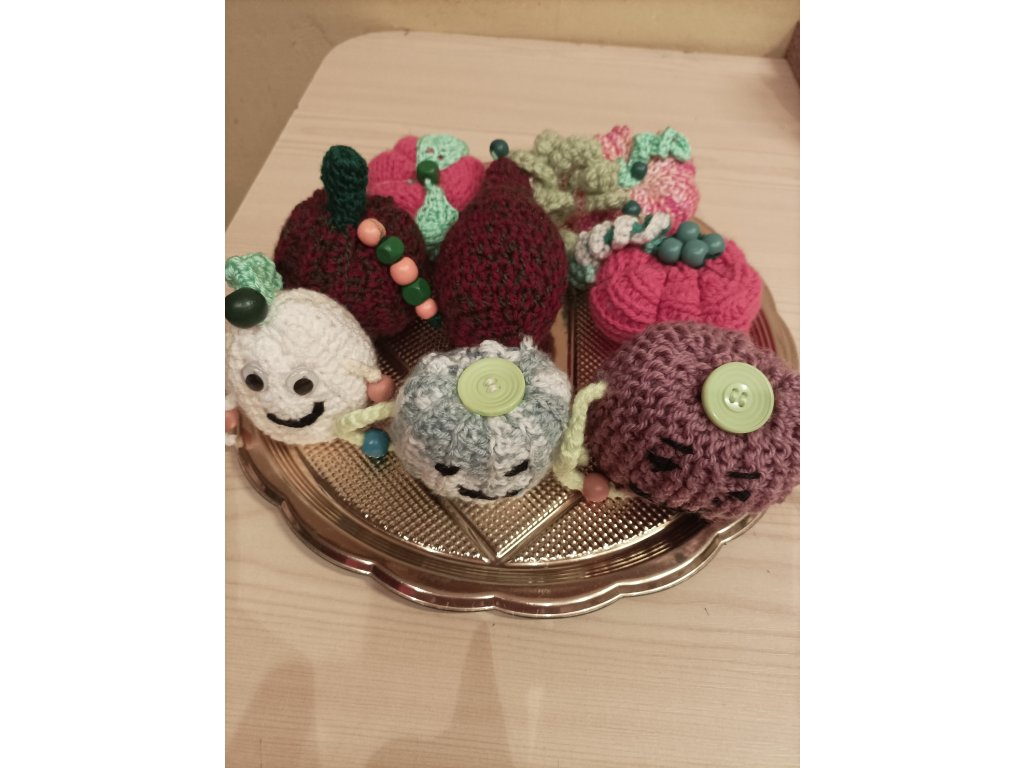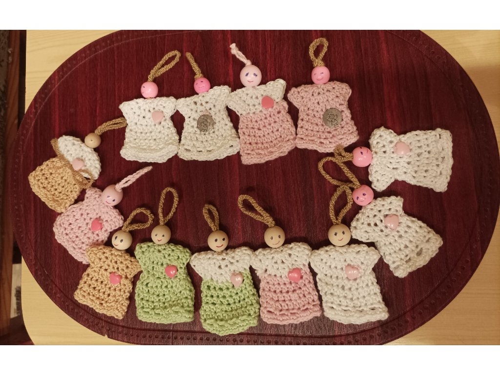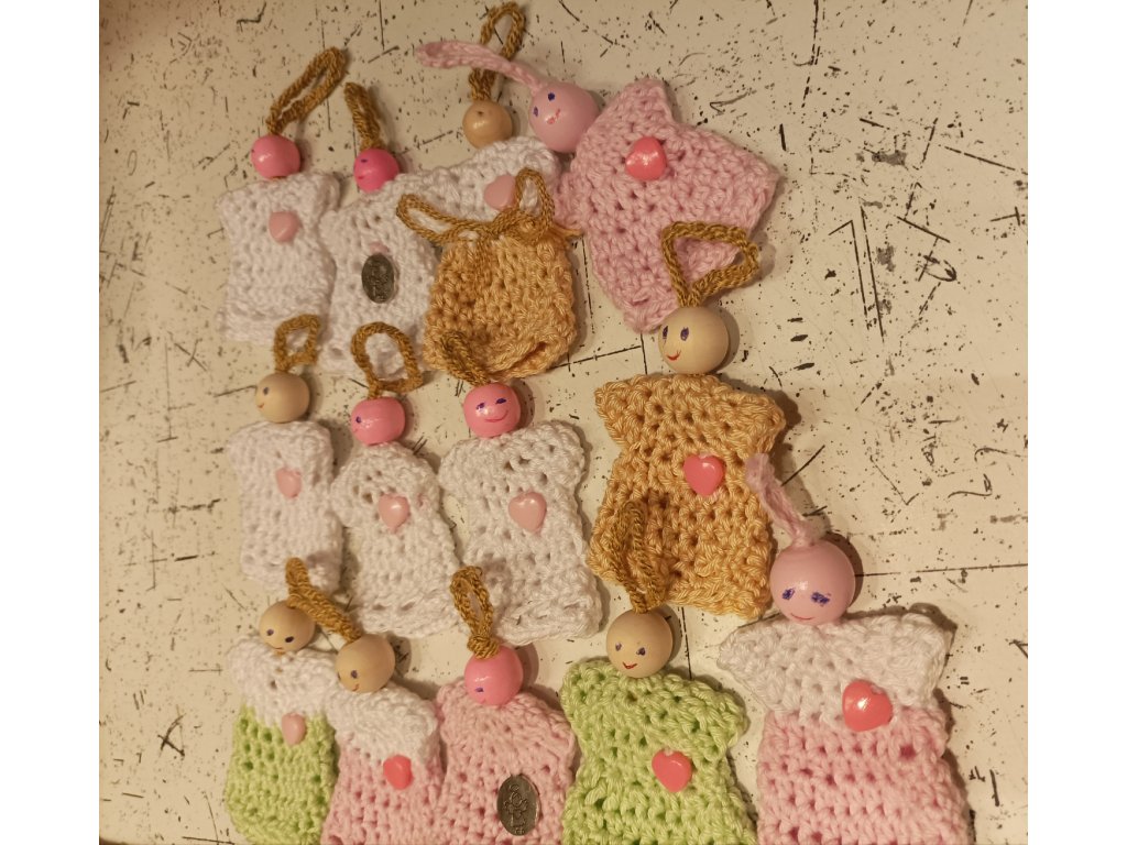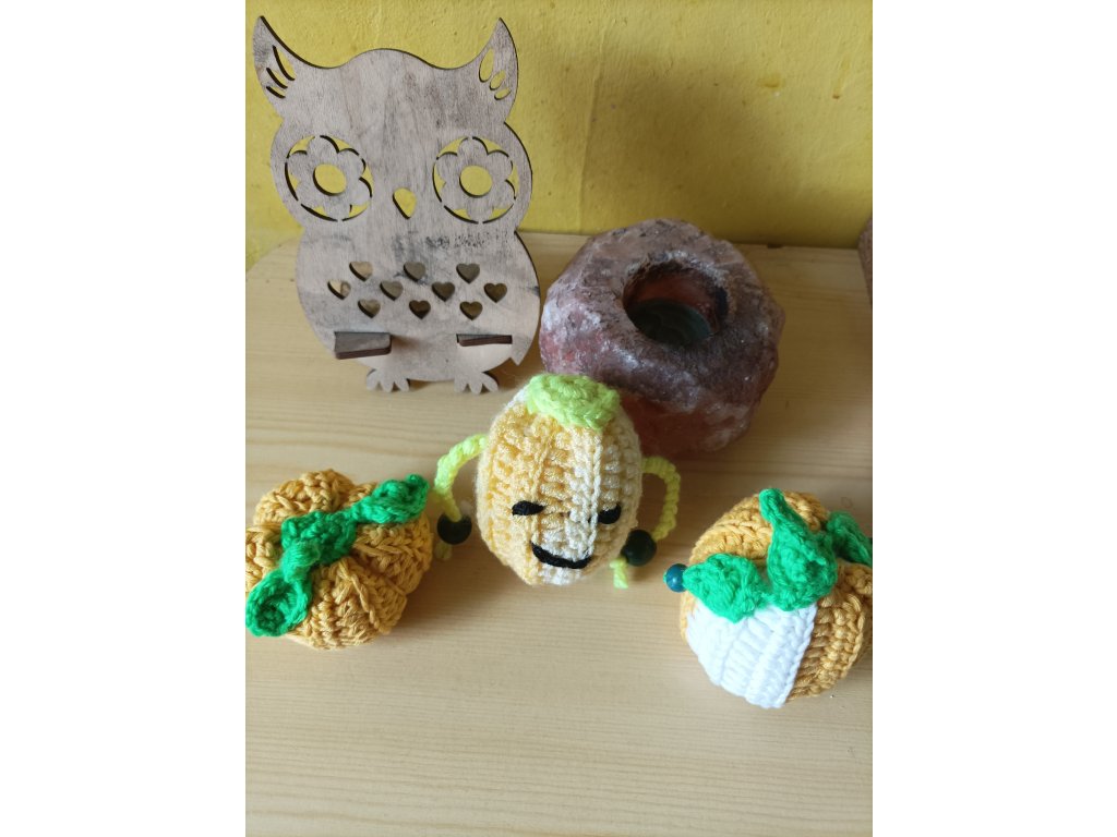 Vyrobené z akrylové a bavlněné příze,dutinkové výplně a dozdobený korálky a knoflíčky, potahovací ručky, obličej.