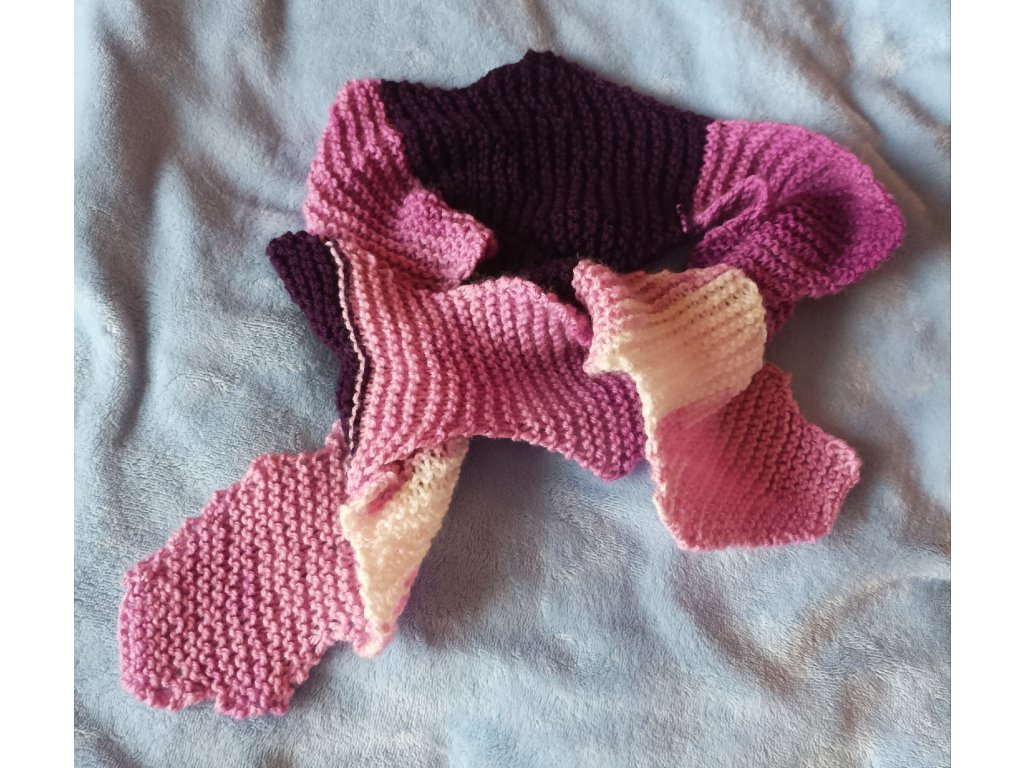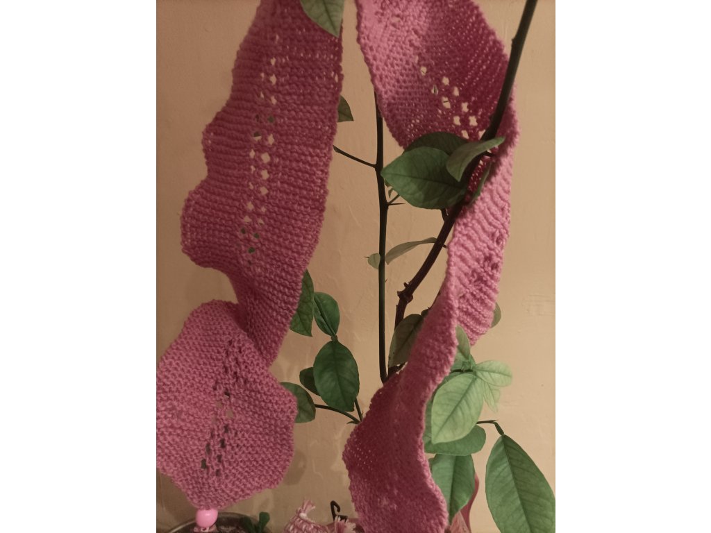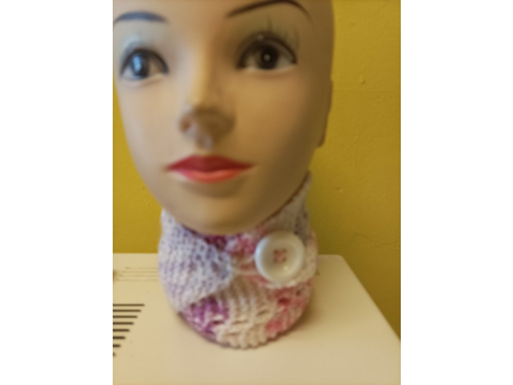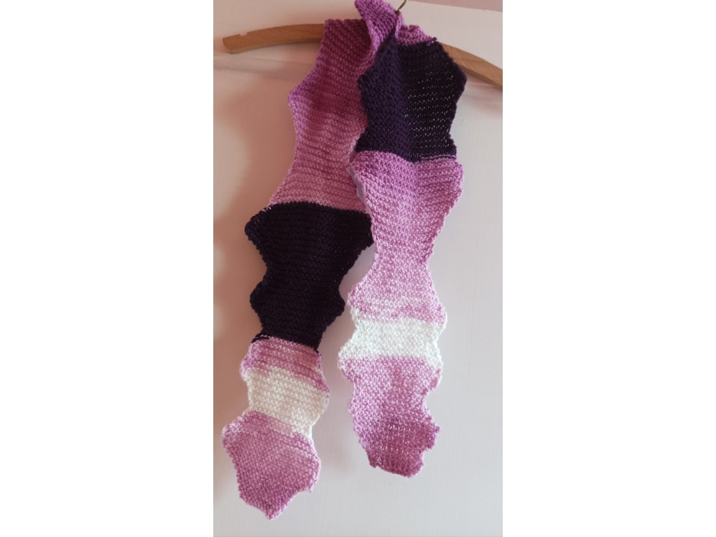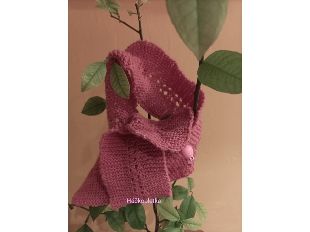 🧣6. Když kytky kvetou - Cikcak šála z akrylové příze pletená s krajkovým vzorkem.Na omotání kolem krku a zapínání na knoflík s poutkem.