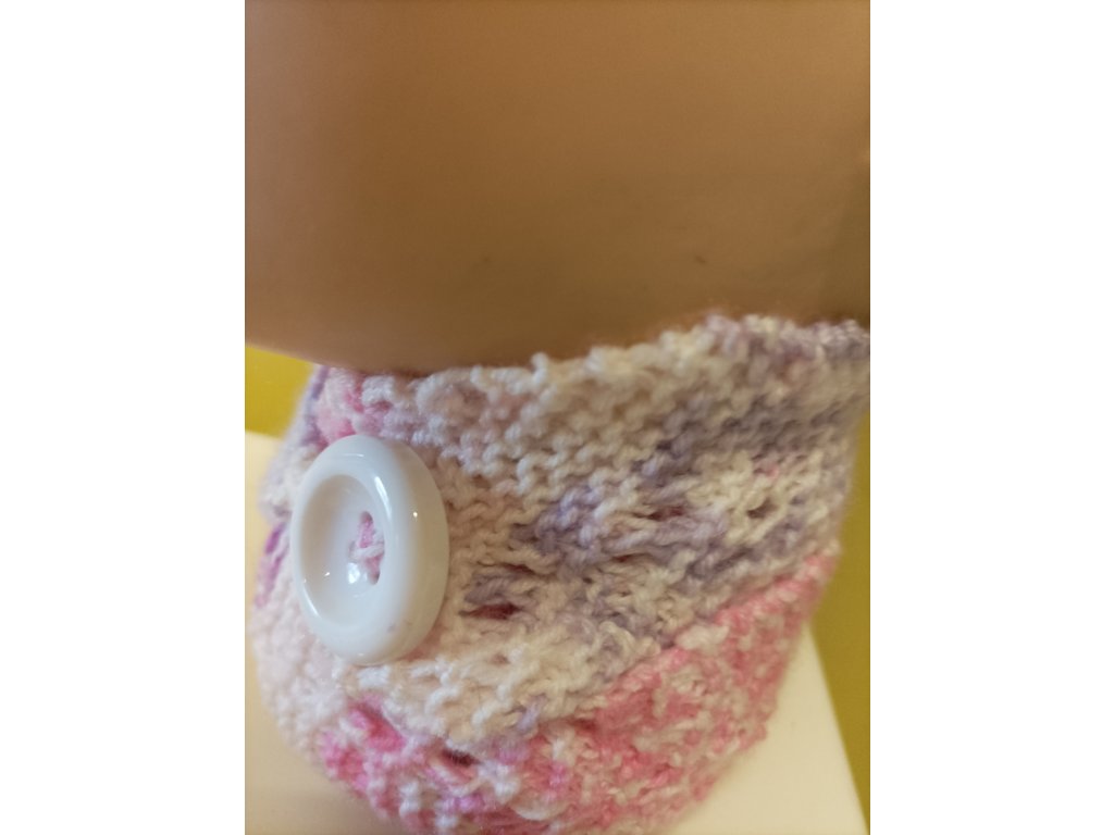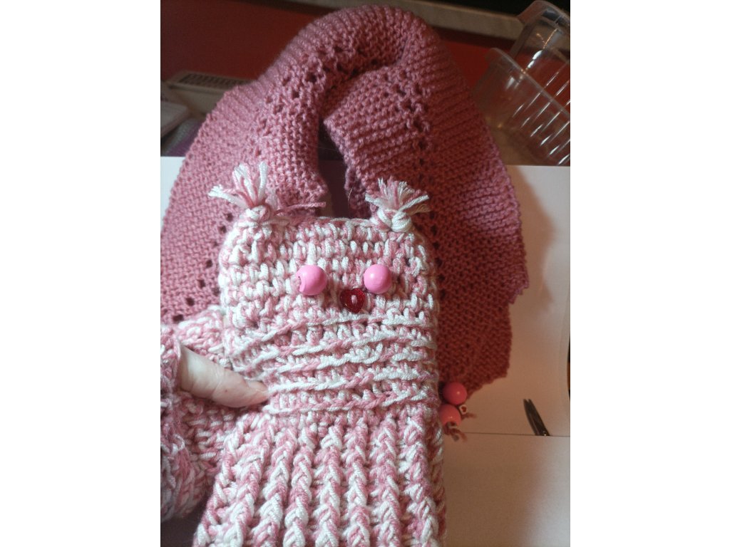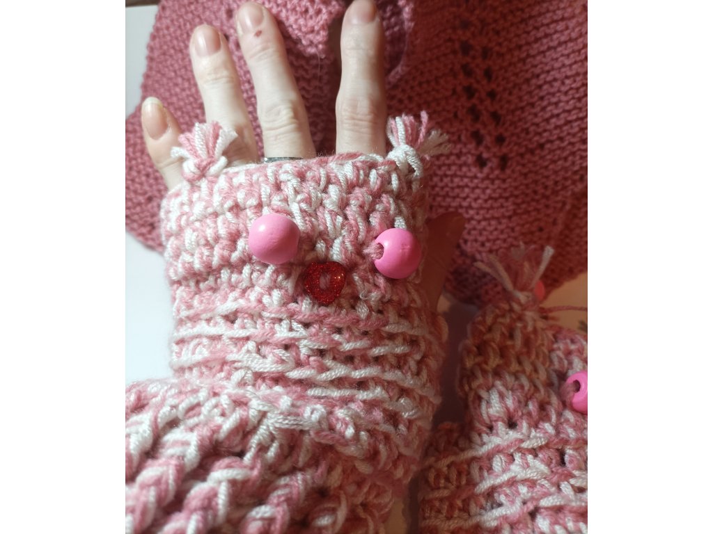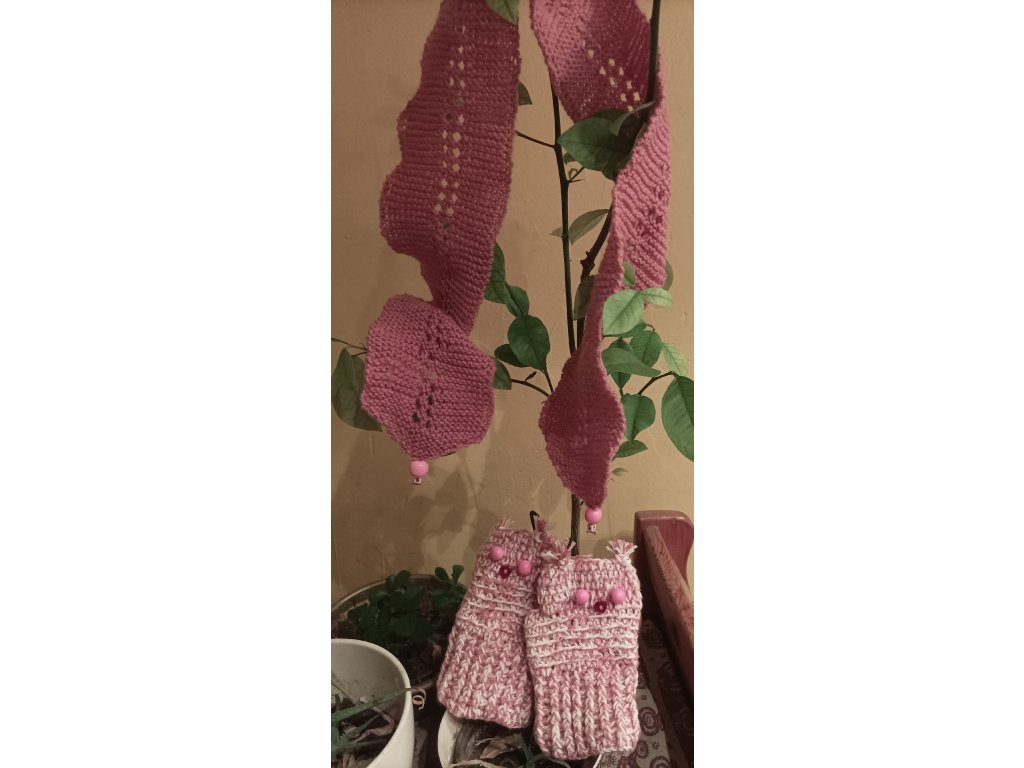 🦉14.Soví hnízdo - sada bezprsťáky karpálníčky a Cikcak šála z akrylu s korálky a střapci- připomínají sovu ve starorůžové barvě s bílou.Ruční praní.Na podzimní i zimní procházky.