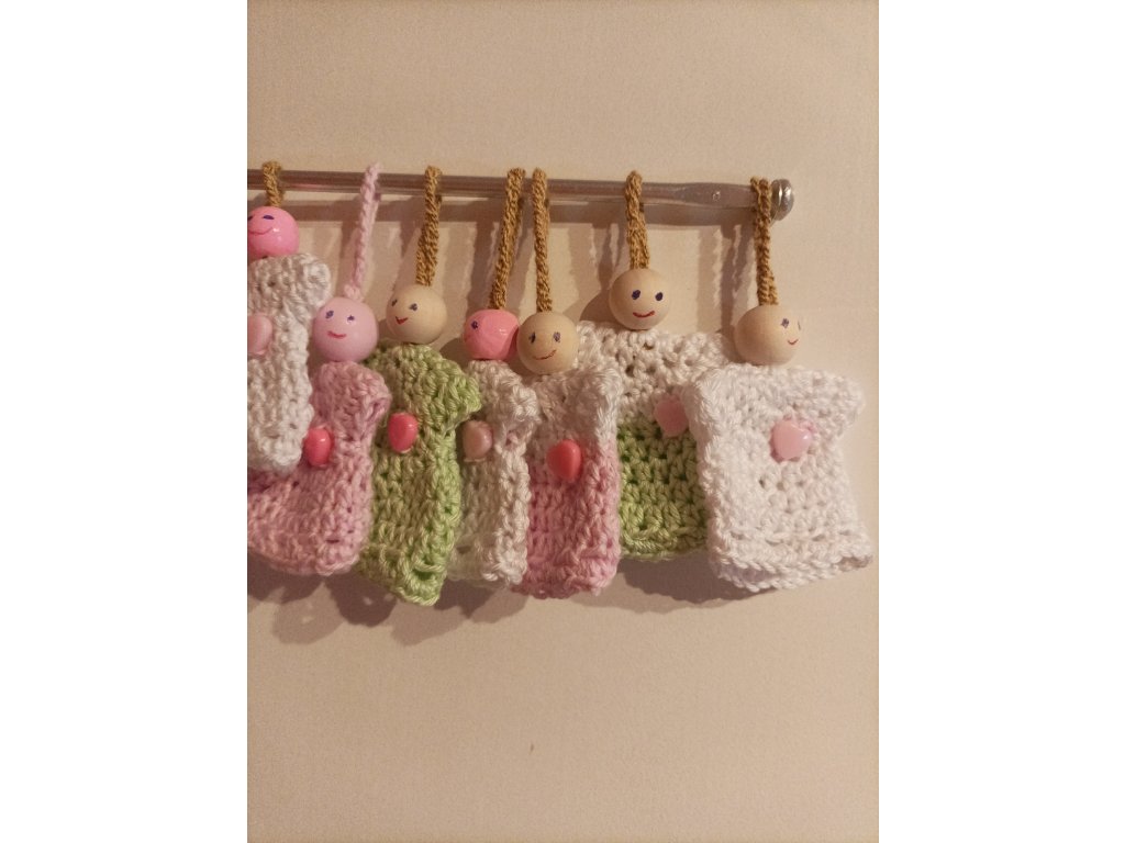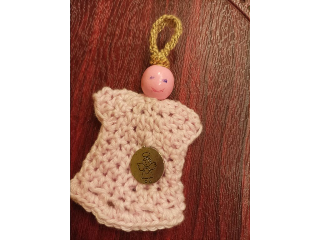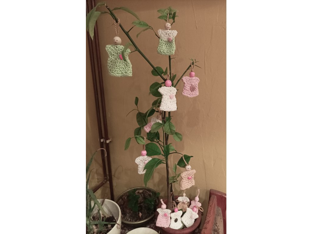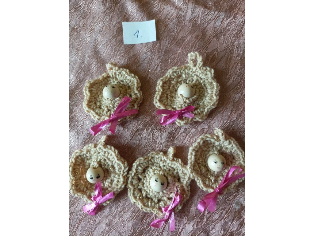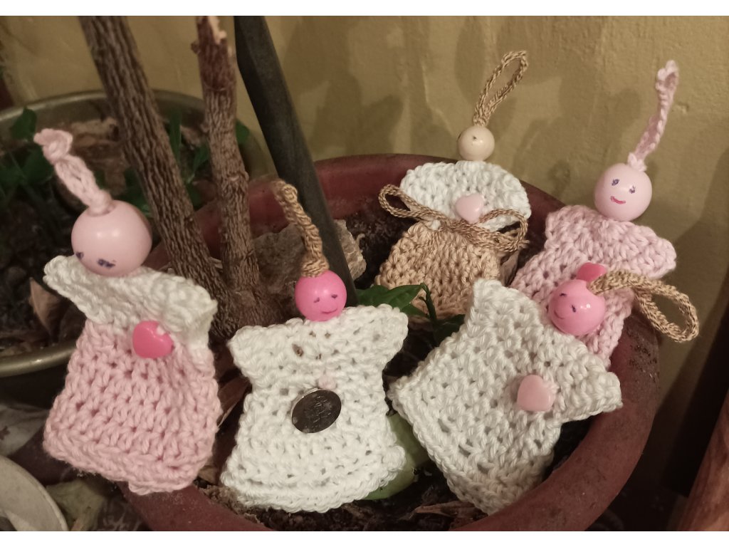 👰11. Andílci pro štěstí - háčkované z bavlněné příze se srdíčkem jako symbolem lásky a dřevěnou hlavičkou.