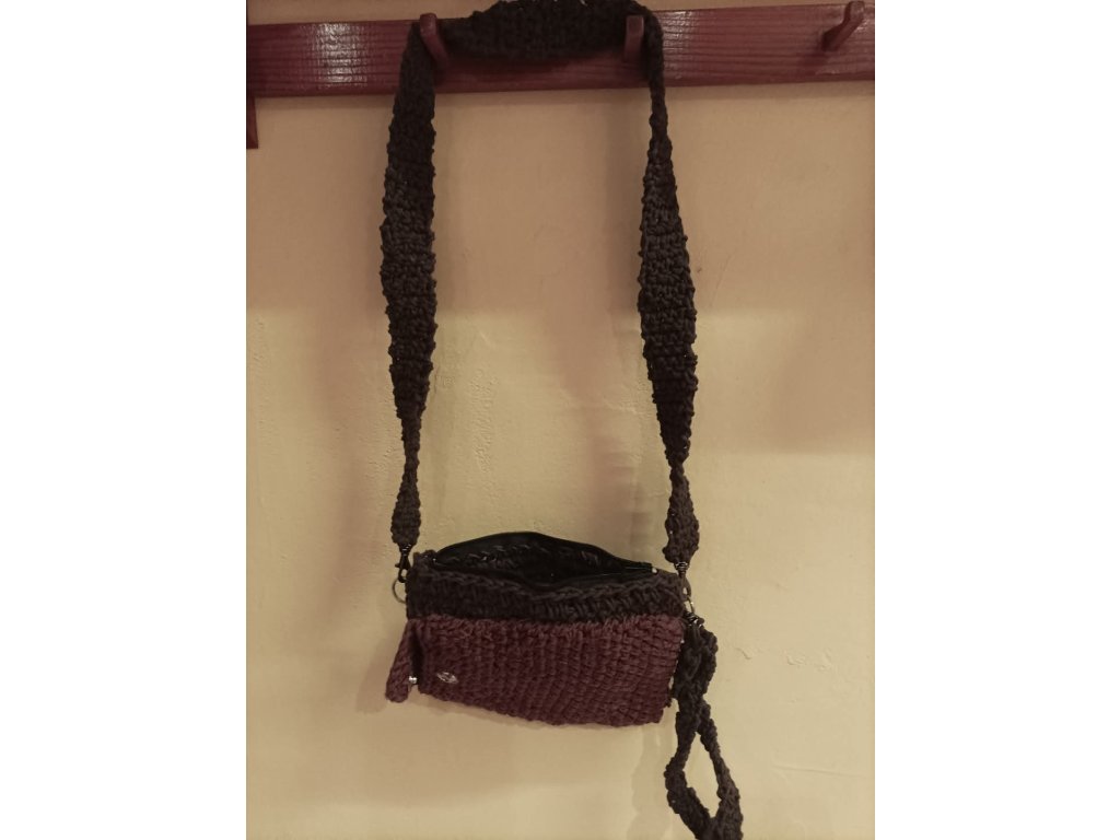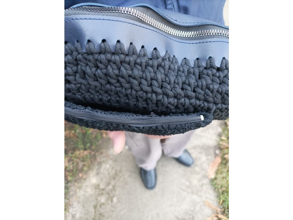 2.Pánská kabelka černá z bavlněných šňůr, kožený zip, vpředu kapsa na mobilní telefon z bavlněné příze zapínání na patentku, vzadu dvojkapsa se zipem větší na ubrousky, brýle apod.Háčkované popruhy na karabinkách.Kabelka je pevná,vleze se do ní vše potřebné včetně peněženky.